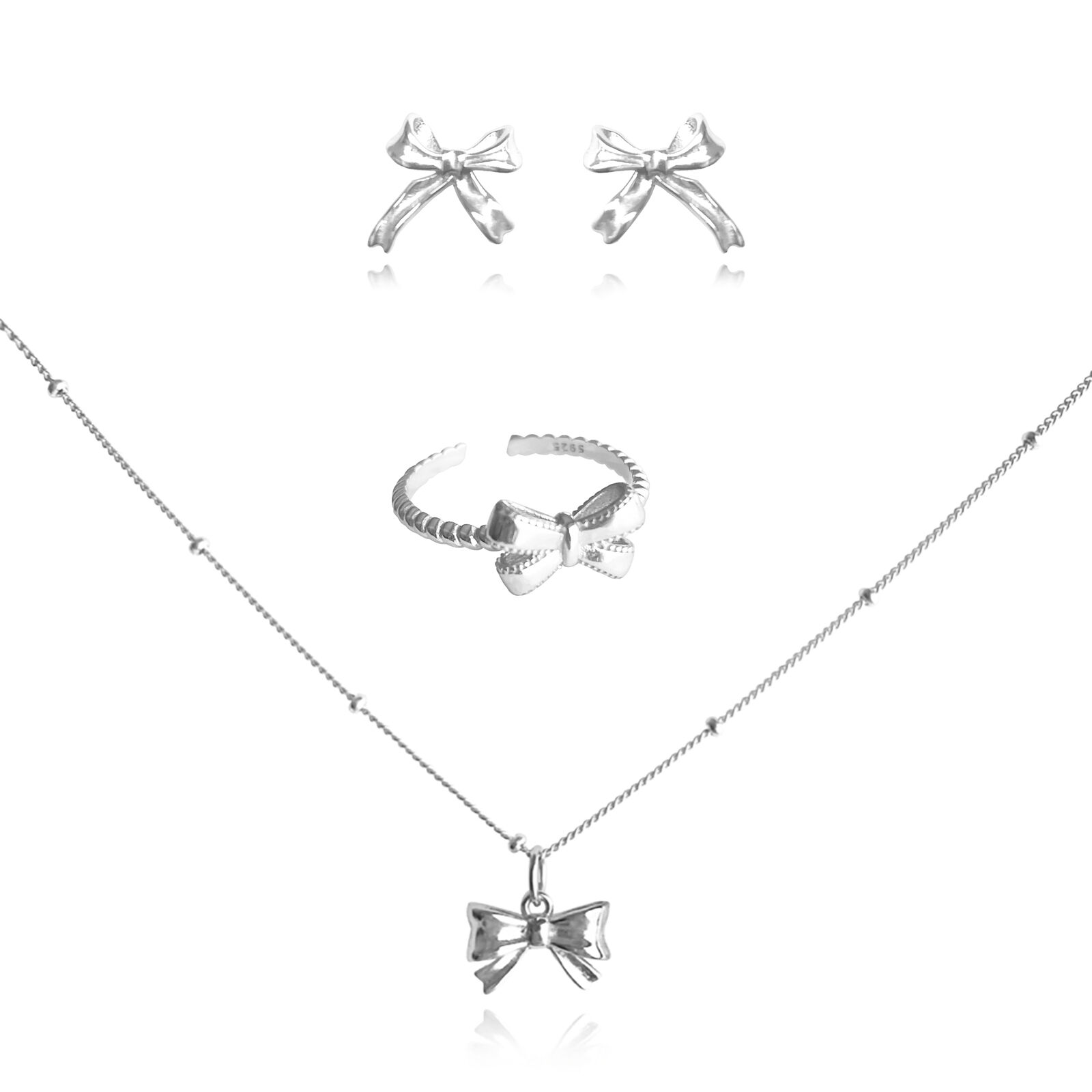 This Gift Set includes: Tilda Dainty Bow Tie Earrings (Silver) + Tilda Artisan Bow Tie Pendant Necklace (Silver) + Tilda Artisan Bow Tie Open Ring (Silver)