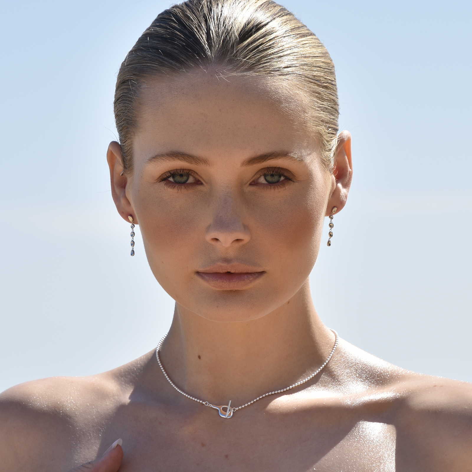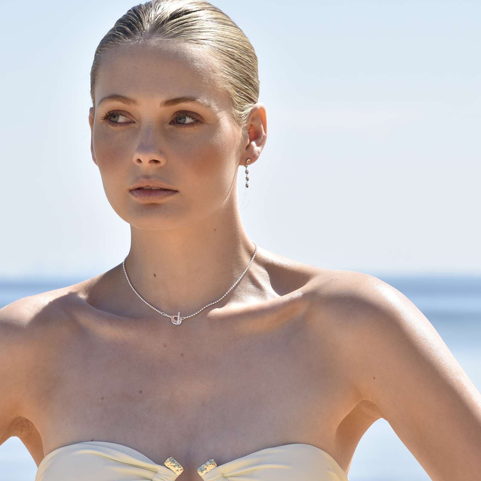 More individuality and less conformity. Introducing Tobi Sculptural Vase Toggle Necklace / Choker - an artsy neckpiece inspired by modern abstract sculpture. This design features a beaded silver neckpiece with a sculptured vase/bottle-shaped toggle in a bar closure. This neckpiece is made in solid sterling silver with precious white rhodium plating for an extra anti-tarnish protection and a brighter silver shine. A contemporary and unique piece that sparks creativity and non-conformity. Perfect for artsy, creative, modern, Nordic, minimalist, chic, smart casual, and everyday wear. Hypoallergenic, nickel, cadmium and lead free.