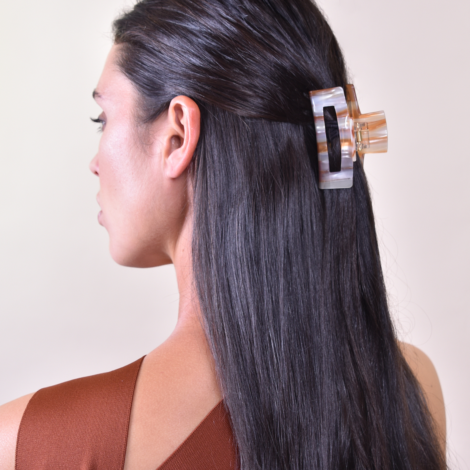 Modern, chic, and unique. Introducing Toffee Modern Shimmer Hair Claw – a stylish hair claw for lovers of brown / neutral shades. The design features a rectangular shaped medium sized hair claw with a toffee shimmer – adding a neutral shimmer to your styling. Perfect modern, casual, trendy, chic, everyday styles and more.