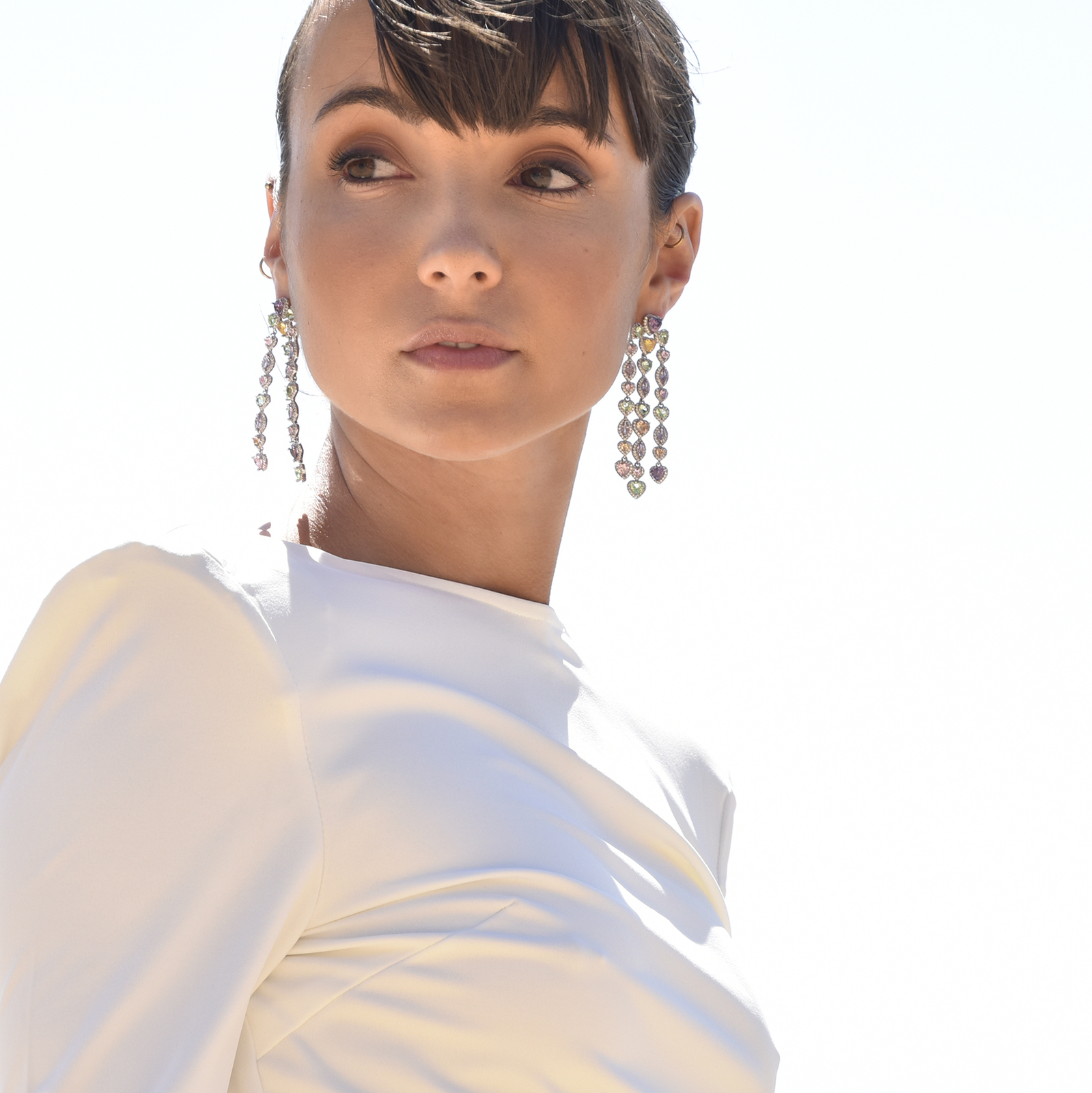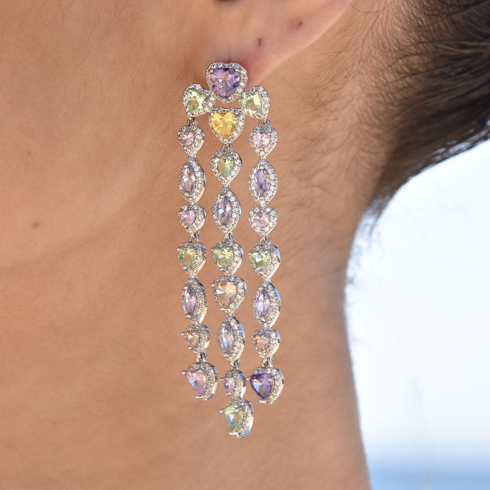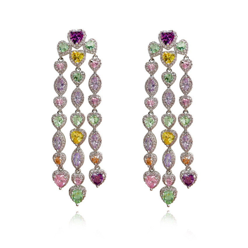 Evoke eye-catching glamour and moonlit shimmer with a splash of colours. Introducing Tourmaline Zirconia Crystal Encrusted Earrings - an artisan crafted high fashion statement for a shimmering boldness and chicness. This design features high quality Austrian zirconias in alternating heart and eye shapes in violet, rose, periwinkle, and lime shades embedded in crystal encrusted frames. The earrings are made in solid sterling silver for enduring and hypoallergenic wear. Perfect for formal, dressy, high fashion, creative styling, red carpet events, smart casual styles and more. Hypoallergenic, nickel, cadmium and lead free.