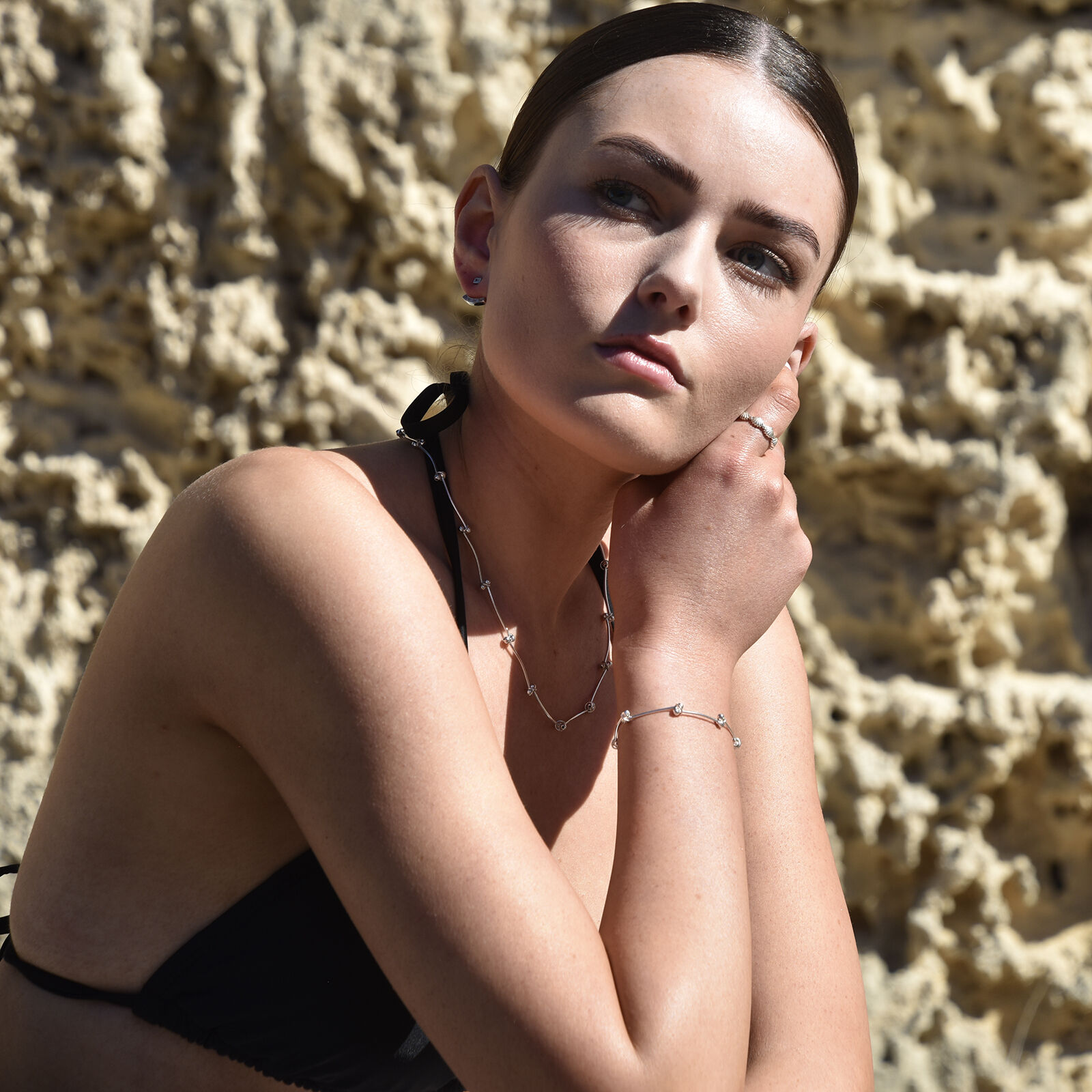 This necklace is 46cm long. Please kindly note that the position of the necklace sitting on your chest can vary from individual to individual depending on your top size. Model is a size 8.