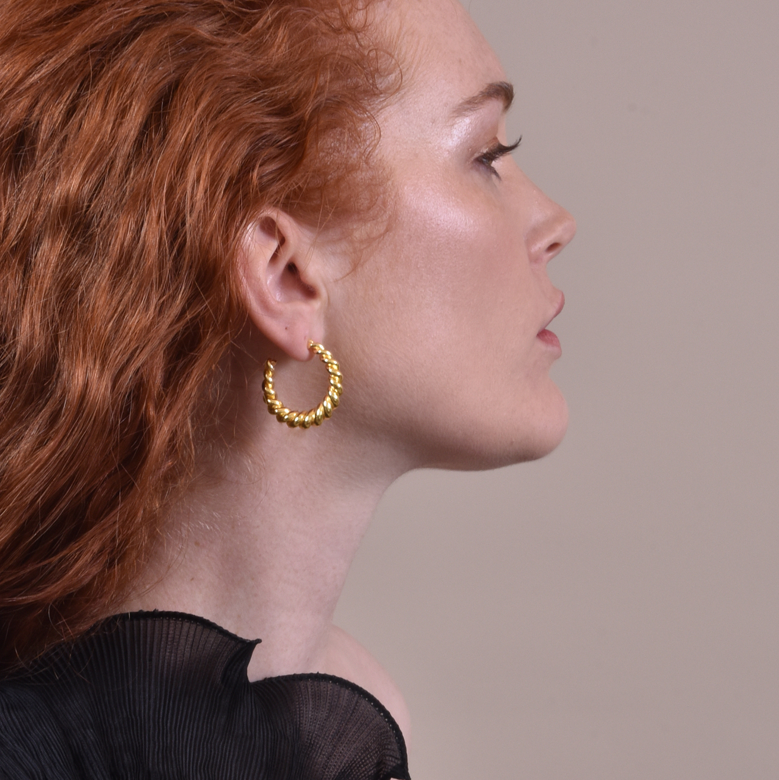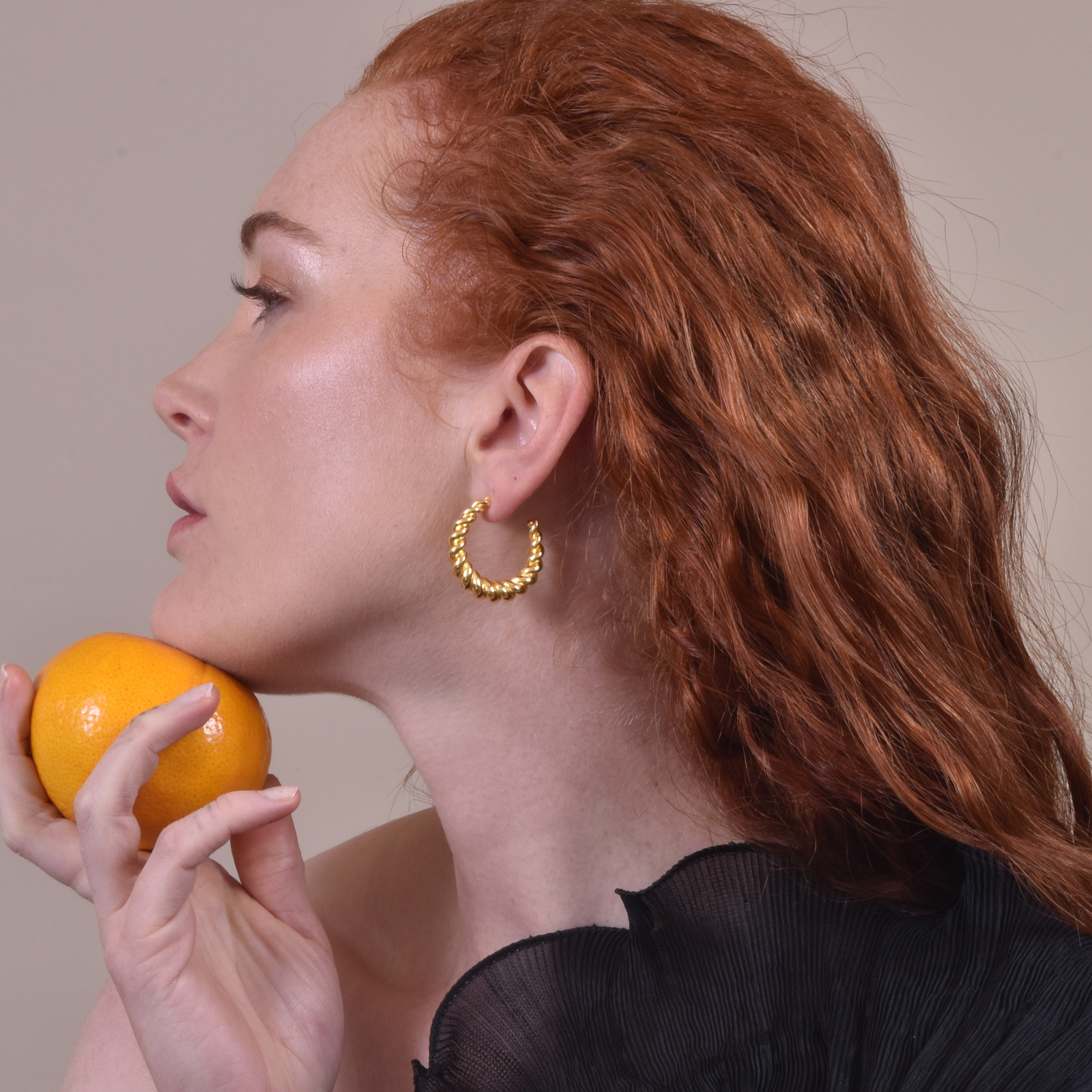 When luxury and quality twist and shine. Introducing Valencia Twisted Gold Croissant Earrings - a high end classic earring style that is luxurious and timeless. Luxury always exists in the details. There is a subtle balance between chunkiness and fineness, where the 'twists' are crafted in a tapered way. Ethically crafted in environmentally friendly brass (nickel free) with 22K thick gold plating, this design makes a classy gold statement that is ensuring and all-time high fashion. Perfect for formal, dressy, high fashion, retro, modern, contemporary, artsy and luxury styles. Nickel, cadmium and lead free.