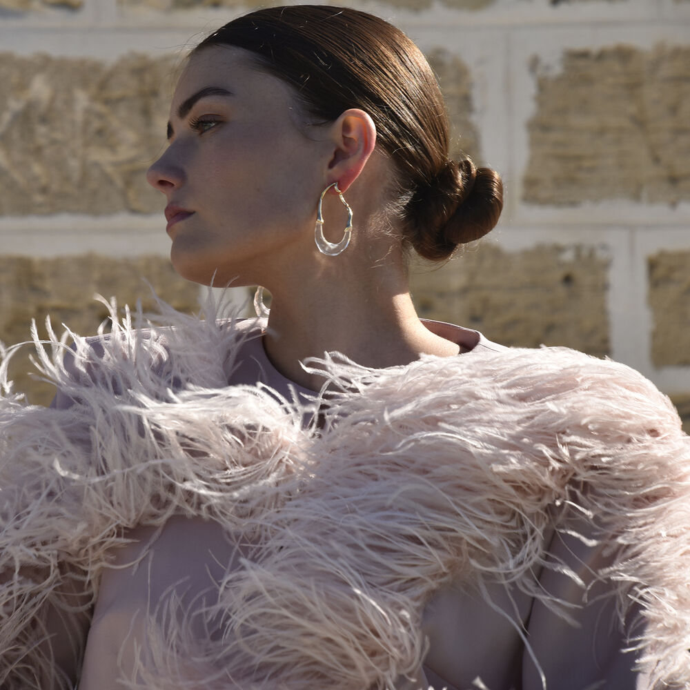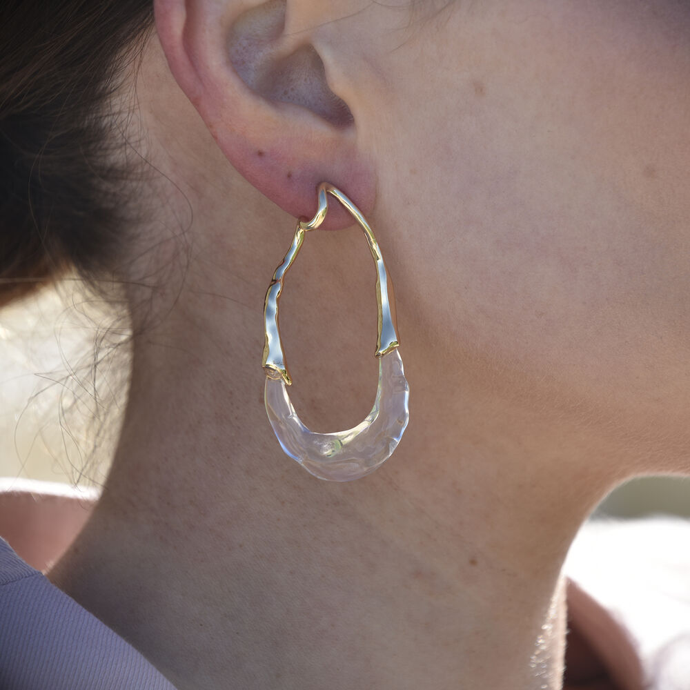 I see metal as fluid architecture. Introducing Vanora Two Tone Fluid Loop Earrings - a contemporary and artsy style ear love that embraces flow, sculptured form and asymmetric beauty. This design features an irregular shaped loop with 2/3 made of metal (environmentally friendly brass with 14K gold plating) and 1/3 made of clear resin. A creative statement that compliments modern, semi-formal, smart casual, artsy, casual styles and more. Hypoallergenic, nickel, cadmium and lead free.