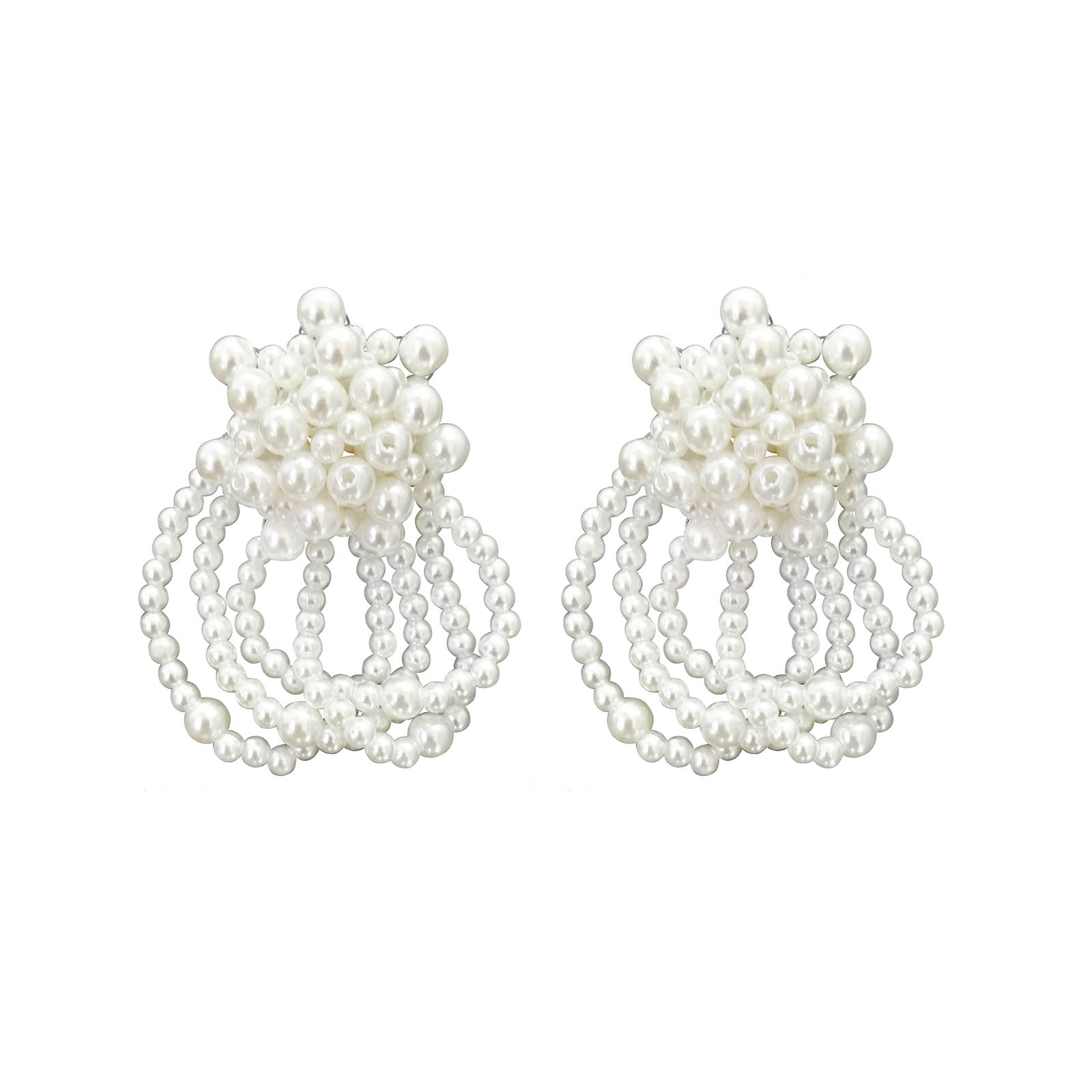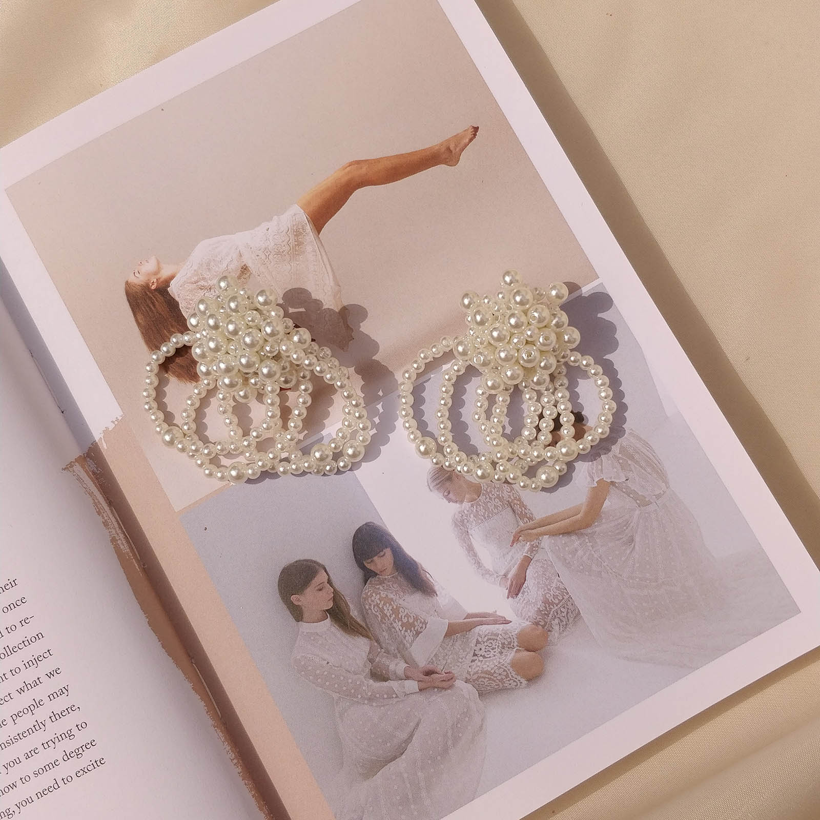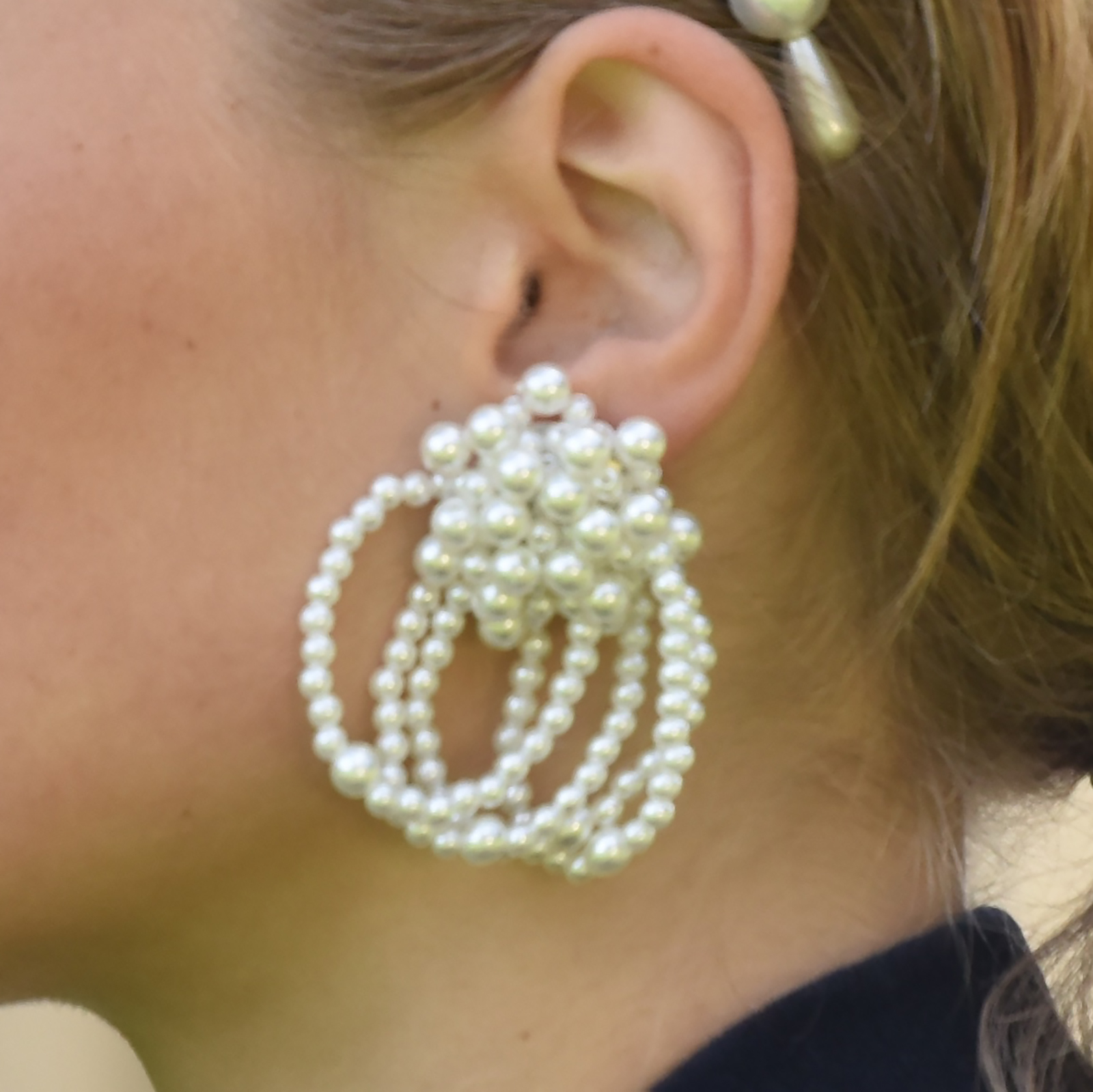 Pearly shine is the new black! As seen in numerous fashion runway events, a pearly 'blossom' kind of ear love makes the undeniable spotlight. This adorable 'vintagy' pearly design incorporates the feature of circled dangling pearl hoops, creating a full and elegant 'occupancy' around your ears. Perfect for runway, fashion events, magazine styling, racing, dressy and showcasing events. 925 silver earring posts. Available for both pierced and non-pierced ears.