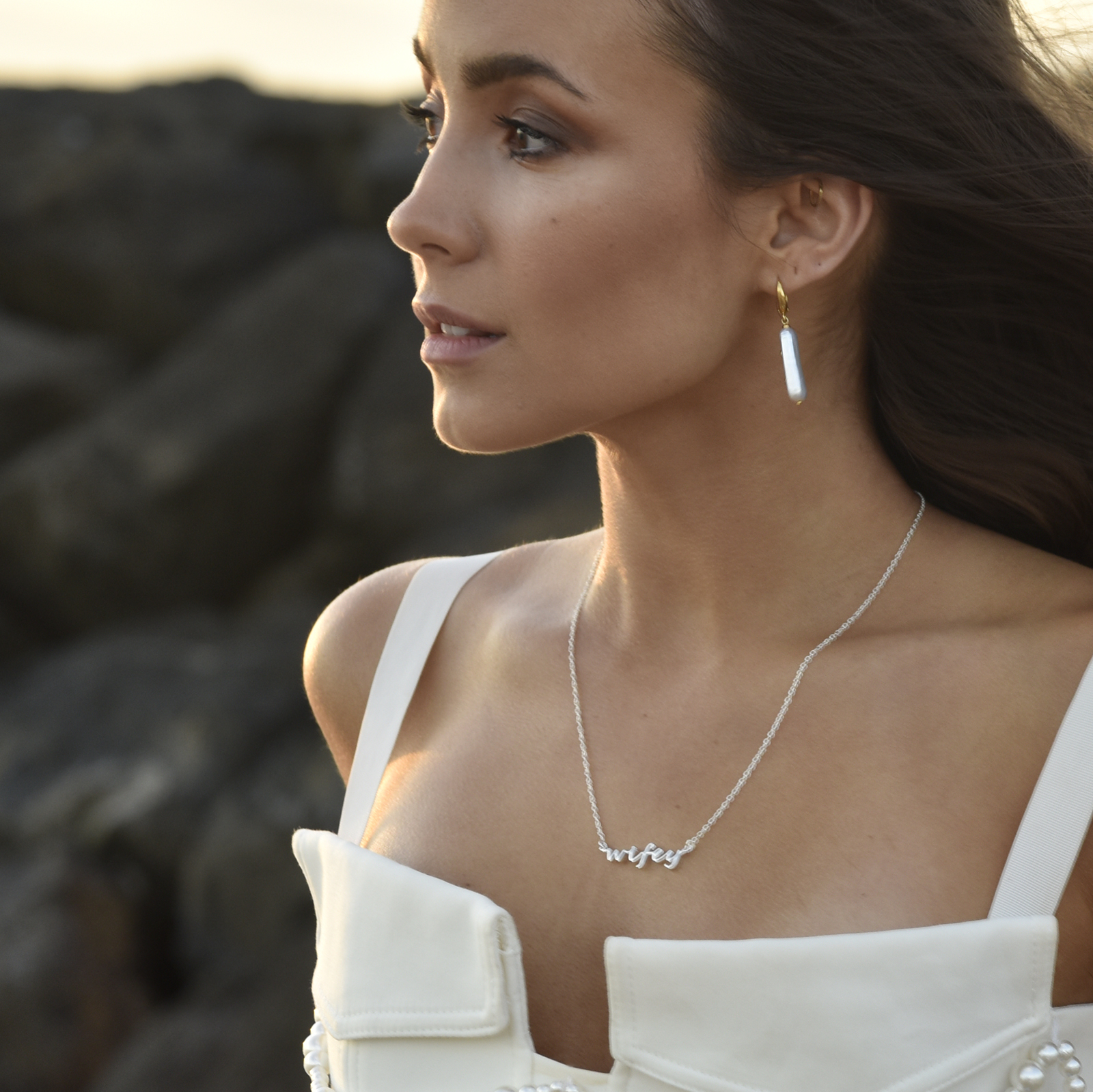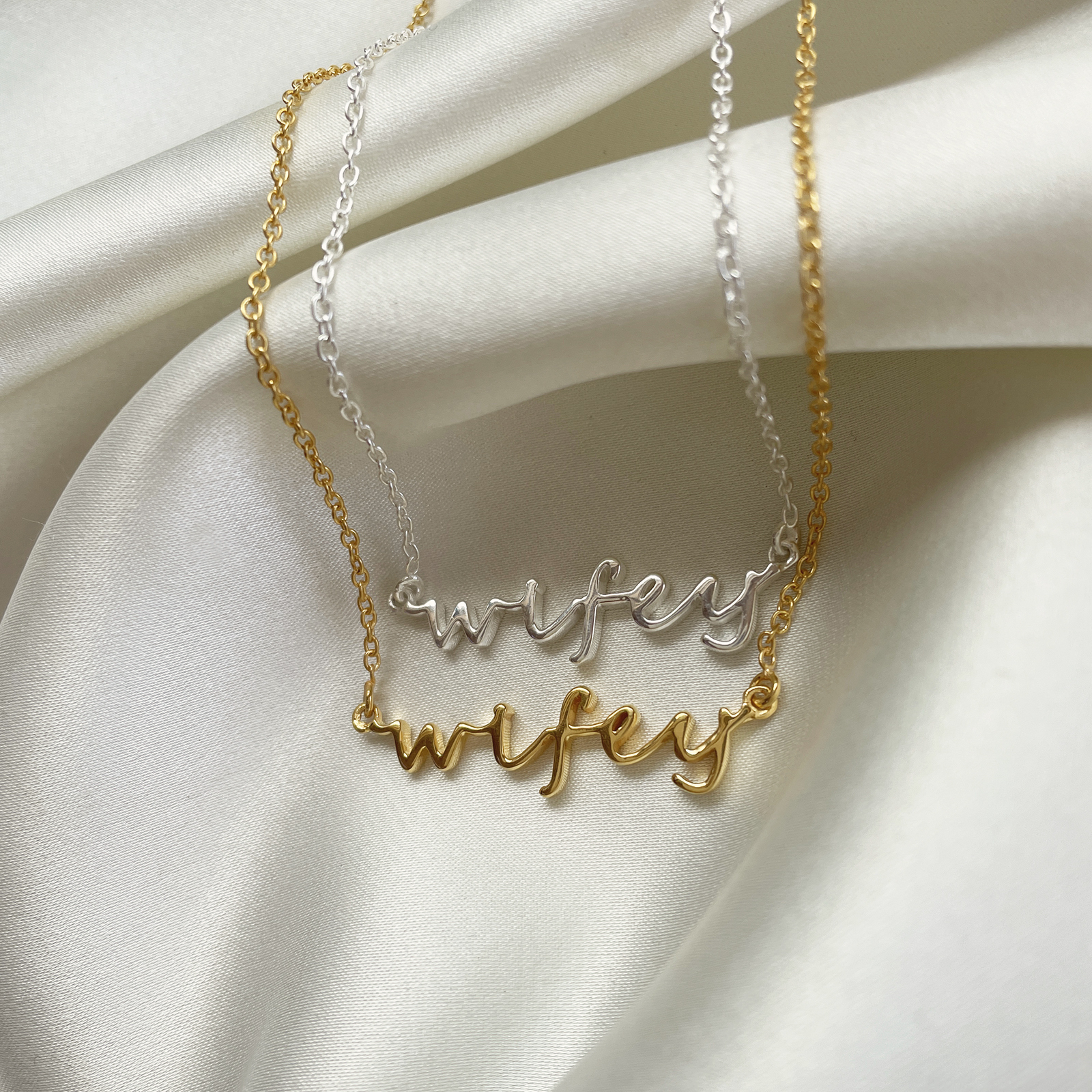 A special way to say love for a lifetime. Introducing You Are My Wifey Necklace (Silver) - a heart-melting love message you deserve. This design features a ‘wifey’ pendant in joint font with a chic and feminine vibe. This neckpiece is made of solid sterling silver with brilliant white rhodium plating (anti-tarnishing) for hypoallergenic and durable wear, as well as a brighter silver shine - made with congruent quality for lifetime wearing. This neckpiece is of a fixed length (49.5cm) to ensure the pendant is always positioned in the middle. It makes a meaningful and loving gift for weddings, anniversaries, and special moments in life. Suitable for all personal styles and all occasions. Hypoallergenic, nickel, cadmium and lead free.