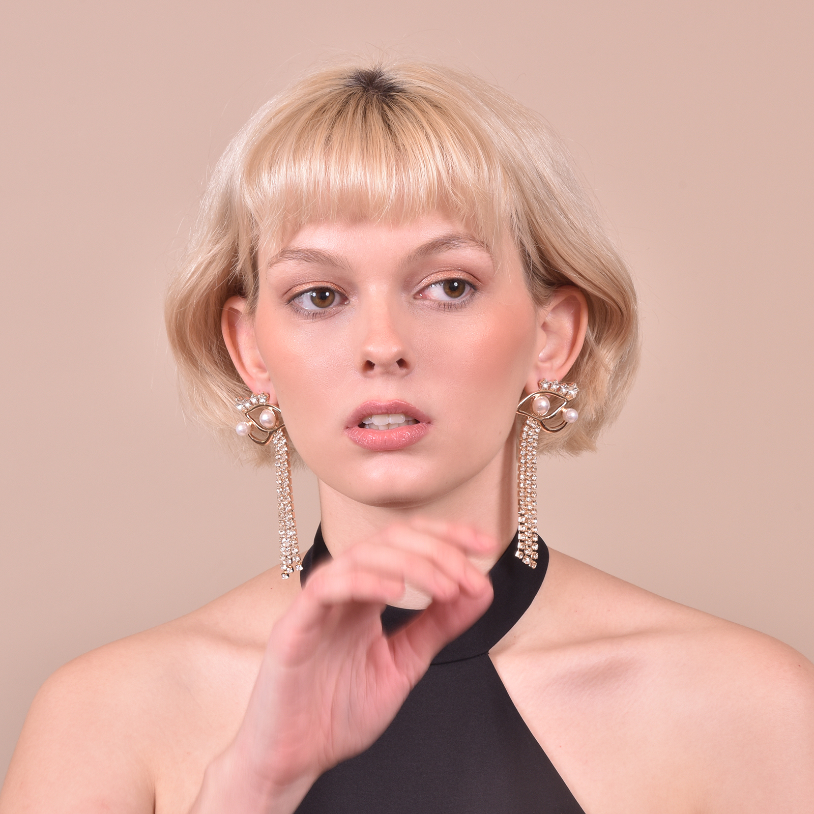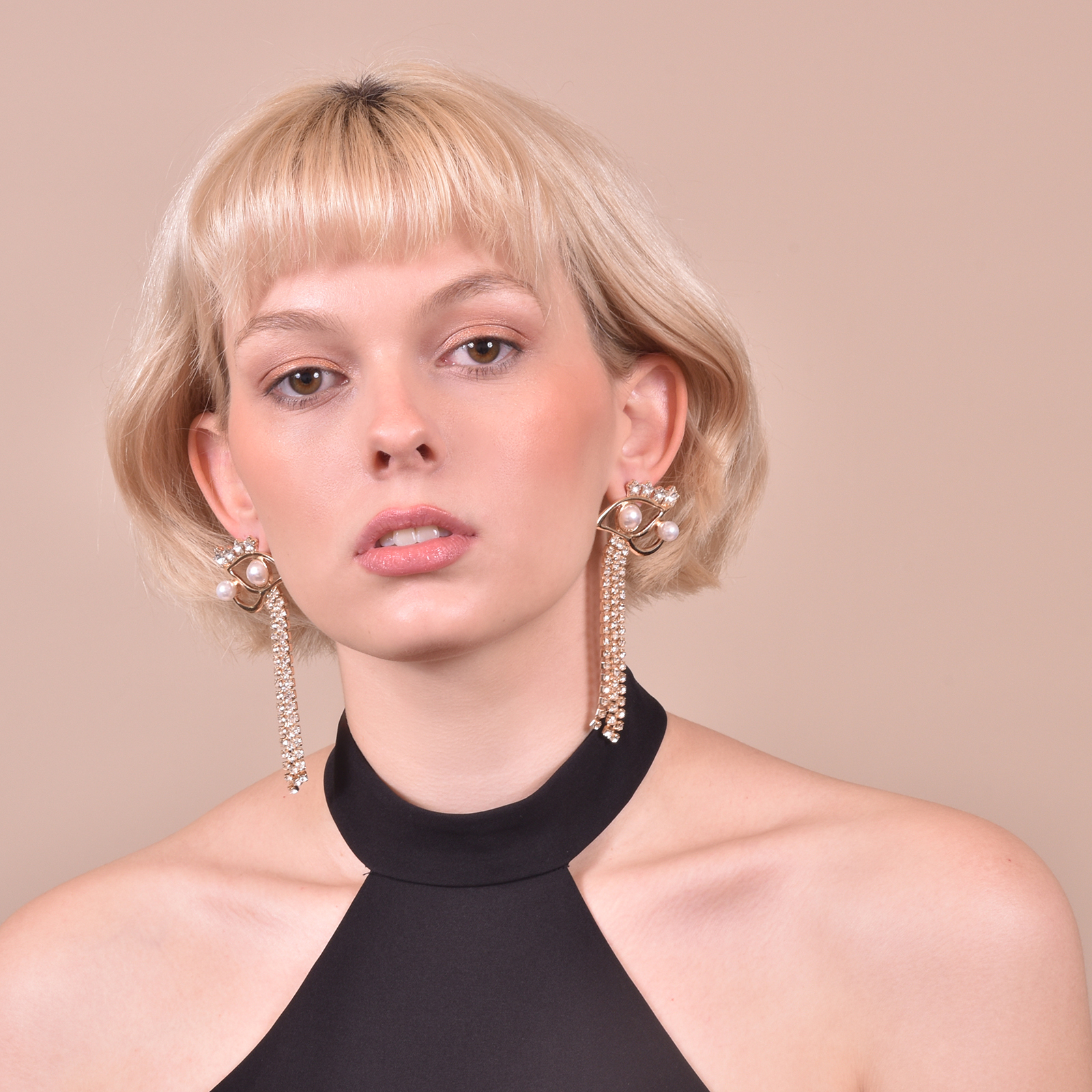 Modern, edgy, extravagant with creativity overflowing. Introducing Zaya Eyes On Me Earrings — wear your uncompromising attitude on your ears! This fun and eye-catching design is crafted in environmentally friendly brass (nickel free) with 14K gold plating. It features cat eyes and shimmering diamante tassels, combined in a quirky fashion. Perfect for creative fashion styling, formal, semi-formal, dressy, racing, fashion events and more. Dare to be different and dare to shine. Available for both pierced and non-pierced ears.