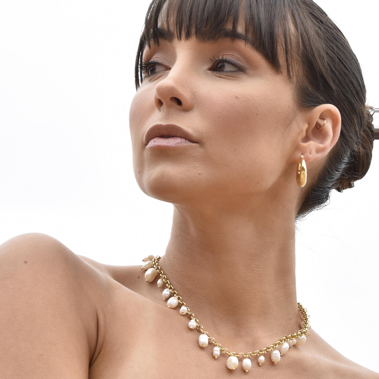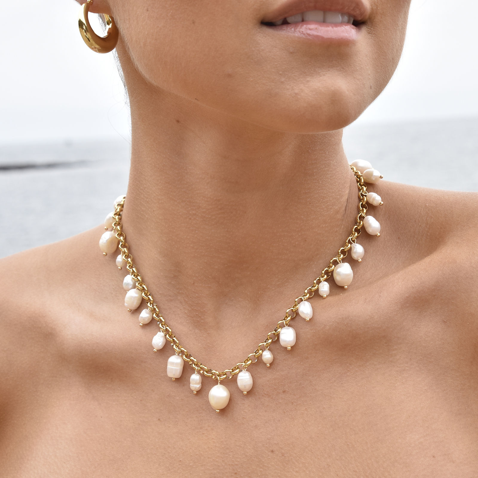 Pearl chicness comes in a full circle. Introducing Zoya Pearl Chain Necklace / Choker - an artisan handmade pearl neckpiece blending elegance and playfulness. This design features a standard gold chain fully adorned with natural freshwater pearls equally spaced. The necklace is made of environmentally friendly brass (nickel free) with 18k gold plating. A pearl statement perfect for modern, coastal, summer, dressy, smart casual, casual styles and more. Hypoallergenic, nickel, cadmium and lead free.